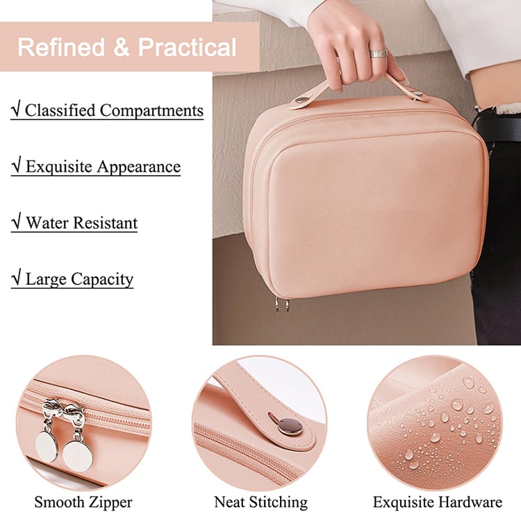 180° flap lay-flat style of the portable toiletry bag, you only simply lay it flat on a surface and have a clear visual of all your items, saving you time and frustration while searching for specific skincare products or makeup brushes.