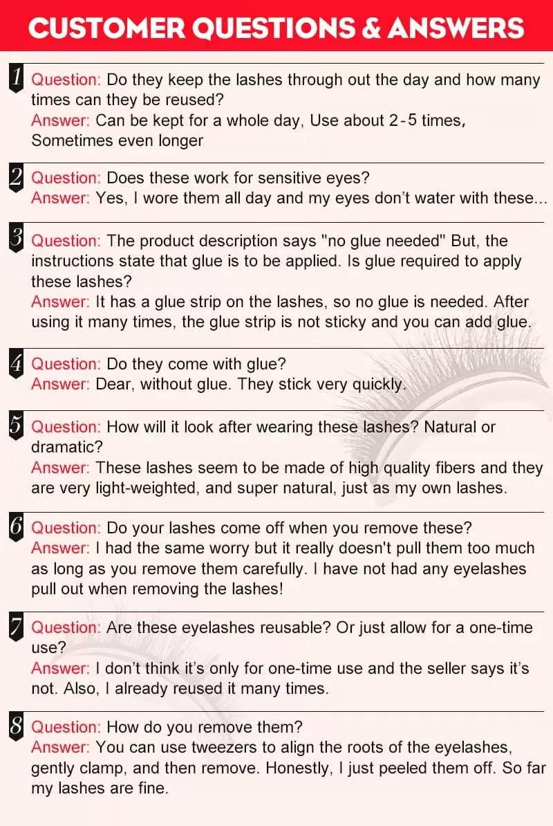 The false lashes are reusable and washable, more sanitary and healthy to use. Comes with replaceable adhesive strips that won't fall off even after repeated use.